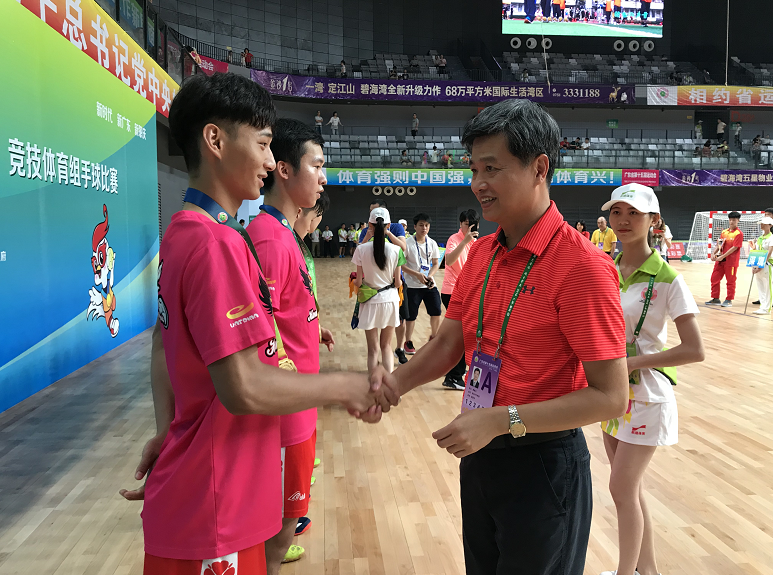 深圳新聞網(wǎng)訊 繼20日結(jié)束的高爾夫球賽奪冠后,深圳代表隊在廣東省運會再下一金。7月21日,在為期5天的肇慶男子青少年組手球比賽中,深圳手球隊以35∶29打敗廣州隊奪得了冠軍,這是深圳男子手球隊在省運會上獲得的第一個五連冠,也是深圳代表團獲得的第一個集體項目金牌。深圳文體旅游局副局長韓星元現(xiàn)場為深圳男子青少年手球隊頒發(fā)金牌。