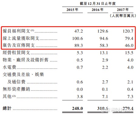 土巴兔的銷售人員開支從2015年的4720萬(wàn)元大幅增至2016年的1.29億元,并在2017年維持1.2億元左右高位。不過隨著公司規(guī)?;\(yùn)營(yíng)的展開,公司線上買量開支卻從1億元降至7940萬(wàn)元。