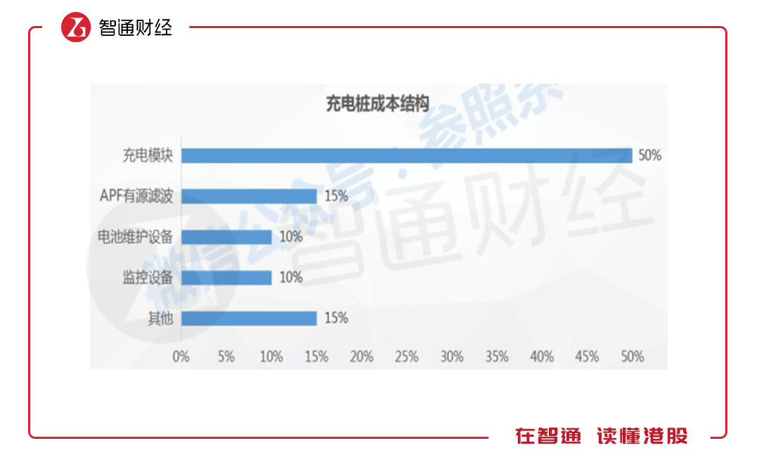 充電樁的上游是零部件的供應(yīng)商,主要為電池維護(hù)設(shè)備、充電模塊、監(jiān)控設(shè)備等,而充電樁的成本構(gòu)成中,充電模塊占比達(dá)50%,充電模塊、監(jiān)控設(shè)備及電池維護(hù)設(shè)備合計(jì)成本占比達(dá)到70%,是充電樁的核心成本。