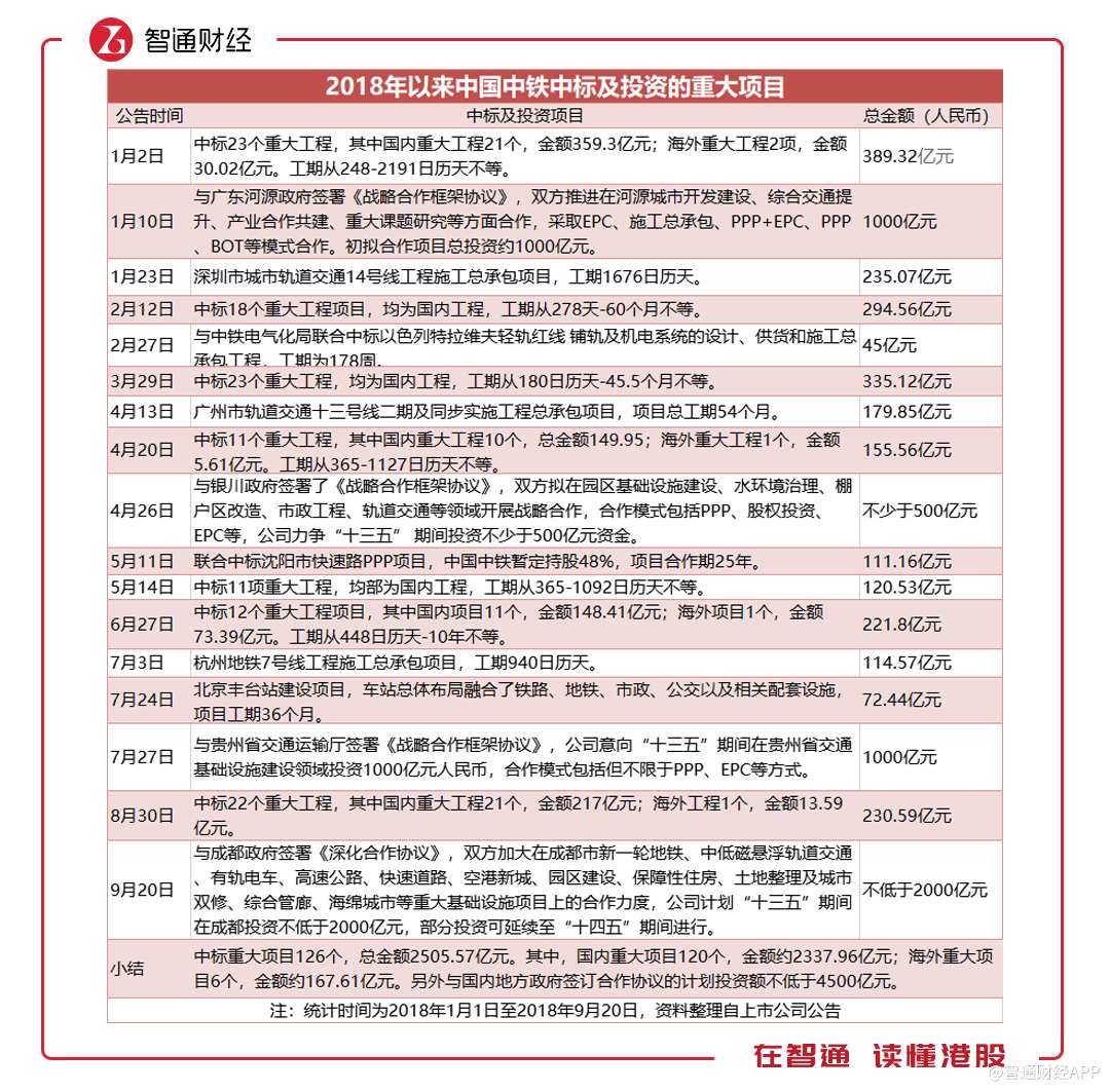 智通財經(jīng)APP注意到,雖然新簽合同金增速放緩,但中標的重大項目卻大幅增加。據(jù)披露,中國中鐵上半年中標的重大工程項目(不含與地方政府簽訂的戰(zhàn)略合作協(xié)議)達到102個,而去年同期僅為49個,涉及項目的金額更是后者的近3倍。