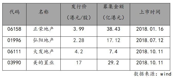 智通財(cái)經(jīng)APP獲悉,10月11日,大發(fā)地產(chǎn)(06111.HK)、美的置業(yè)(03990.HK)同時(shí)在港交所成功掛牌上市,加上此前于1月份上市的正榮地產(chǎn)(06158.HK),7月份上市的弘陽地產(chǎn)(01996,HK),2018年港股上市內(nèi)地房地產(chǎn)企業(yè)增至四家,共計(jì)募資金額為92.15億港元。