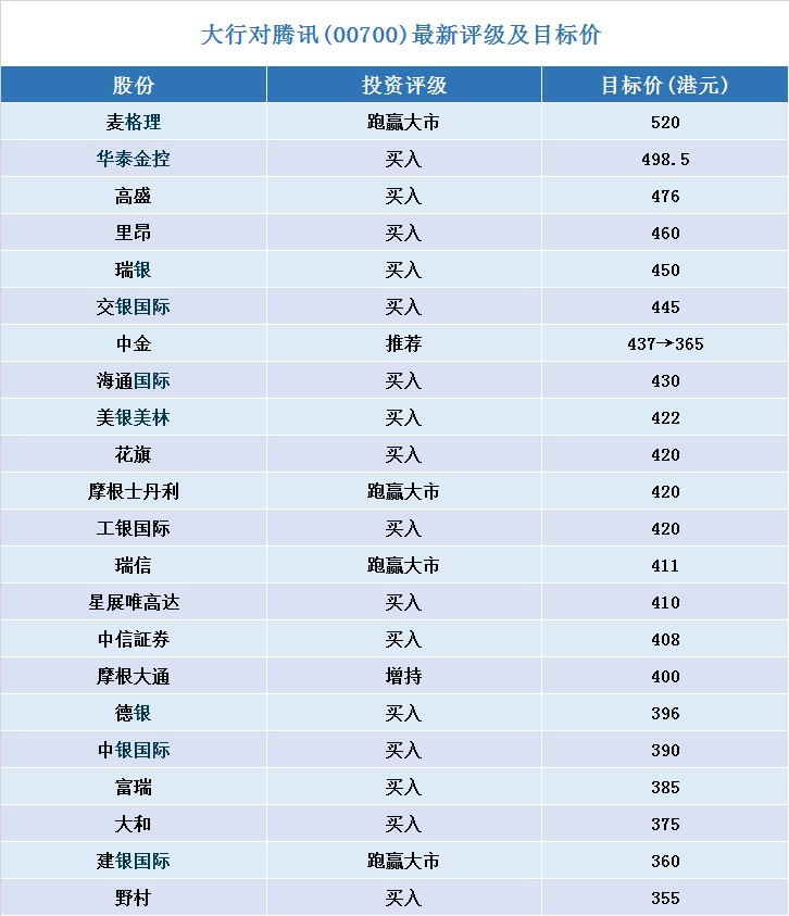 經(jīng)智通財經(jīng)APP整理的騰訊(00700)最新投資評級及目標(biāo)價如下: