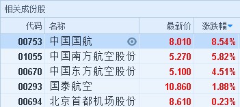 智通財(cái)經(jīng)APP獲悉,受益于國際原油價格下挫,航空股全線大漲。截至9時20分,中國國航(00753)漲8.54%,報價8.01港元,南方航空(01055)漲5.82%,報5.27港元,東方航空(00670)漲4.51%,報5.1港元,國泰航空(00293)漲1.88%,首都機(jī)場(00694)漲0.23%。