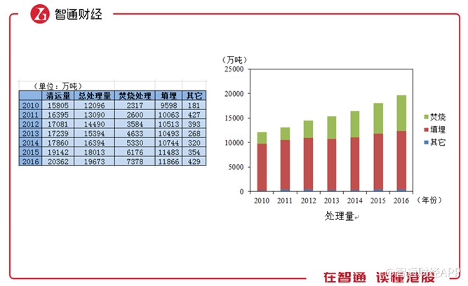 智通財(cái)經(jīng)APP統(tǒng)計(jì)到,2010至2016年,生活垃圾清運(yùn)量和處理量由15805、12096萬(wàn)噸增長(zhǎng)至20362、19673萬(wàn)噸,無(wú)害化處理率由76.5%增至96.6%,可見(jiàn)垃圾處理率得到了明顯提高。