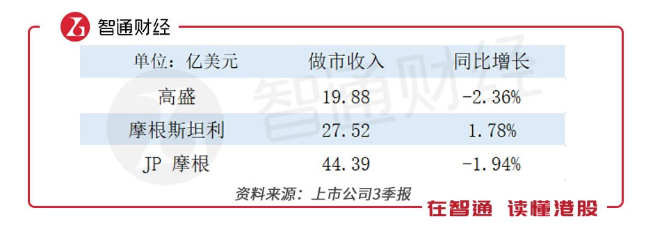 由于JP摩根有大部分營(yíng)業(yè)收入來(lái)自商業(yè)銀行的業(yè)務(wù),而高盛和摩根斯坦利則幾乎沒(méi)有。為了更有針對(duì)性地對(duì)比,智通財(cái)經(jīng)APP只統(tǒng)計(jì)JP摩根中的“公司和投資銀行”和“資產(chǎn)和財(cái)富管理”這兩個(gè)板塊業(yè)務(wù)的數(shù)據(jù)。