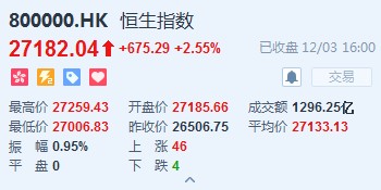 智通財(cái)經(jīng)APP獲悉,中美貿(mào)易摩擦憂慮減退,市場(chǎng)情緒得到提振,恒指早盤高開(kāi)2.56%,報(bào)27185.66點(diǎn)。全日維持高位震蕩,截至收盤,恒生指數(shù)漲675.29點(diǎn)或2.55%,報(bào)27182.04點(diǎn),全日成交額達(dá)1296.25億。國(guó)企指數(shù)漲2.45%,報(bào)10882.16點(diǎn),紅籌指數(shù)漲1.21%,報(bào)4391.2點(diǎn)。