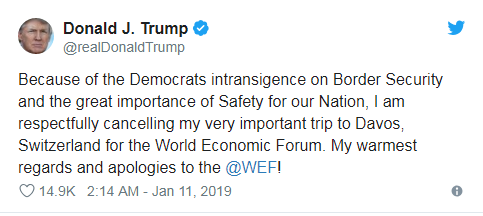 特朗普表示,由于民主黨在邊境安全問(wèn)題上的頑固態(tài)度和國(guó)家安全的重要性,他謹(jǐn)慎地取消前往瑞士達(dá)沃斯參加世界經(jīng)濟(jì)論壇的行程,并向世界經(jīng)濟(jì)論壇致以問(wèn)候和歉意。另外,美國(guó)政府高級(jí)官員表示,即使本月晚些時(shí)候政府仍處于關(guān)閉狀態(tài),美國(guó)財(cái)政部長(zhǎng)姆努欽將帶領(lǐng)美國(guó)政府代表團(tuán)出席達(dá)沃斯論壇。