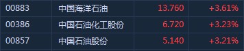 智通財(cái)經(jīng)APP獲悉,受國(guó)際原油價(jià)格持續(xù)走高刺激,港股石油股全線大漲。截至9時(shí)55分,中海油(00883)漲3.61%,報(bào)價(jià)13.76港元,中石化(00386)漲3.23%,中石油(00857)漲3.21%。
