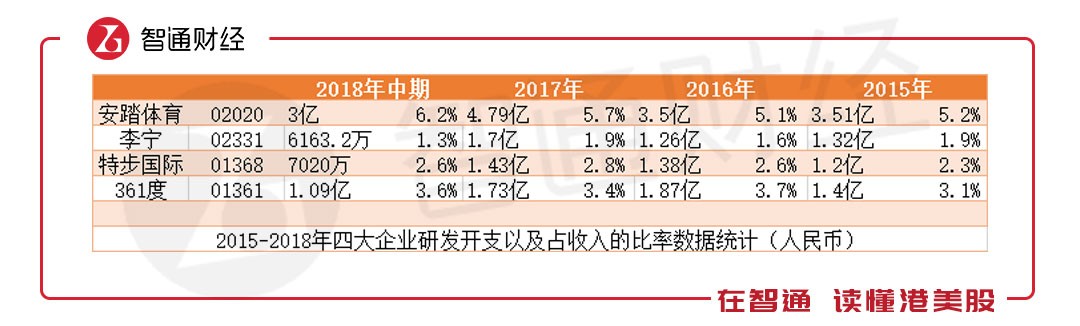 從2015-2018年中期,李寧的研發(fā)支出一直是國內(nèi)四大體育用品企業(yè)中最低的。以2018年上半年為例,李寧的研發(fā)支出為6163.2萬元,占當(dāng)期收入的比率僅為1.3%,而安踏研發(fā)支出高至3億元,就連特步、361的研發(fā)支出比率都高于李寧。