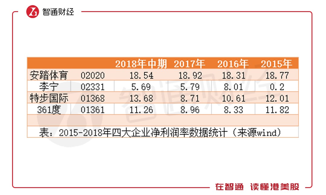 然而,高毛利優(yōu)勢并未在利潤中體現(xiàn)。2015年時,李寧的凈利潤率為0.2%,2016年時上升至8.01%,2018年上半年時,安踏、特步、361的凈利潤率分別為18.54%、13.68%、11.26%,均遠(yuǎn)高于李寧的5.69%。