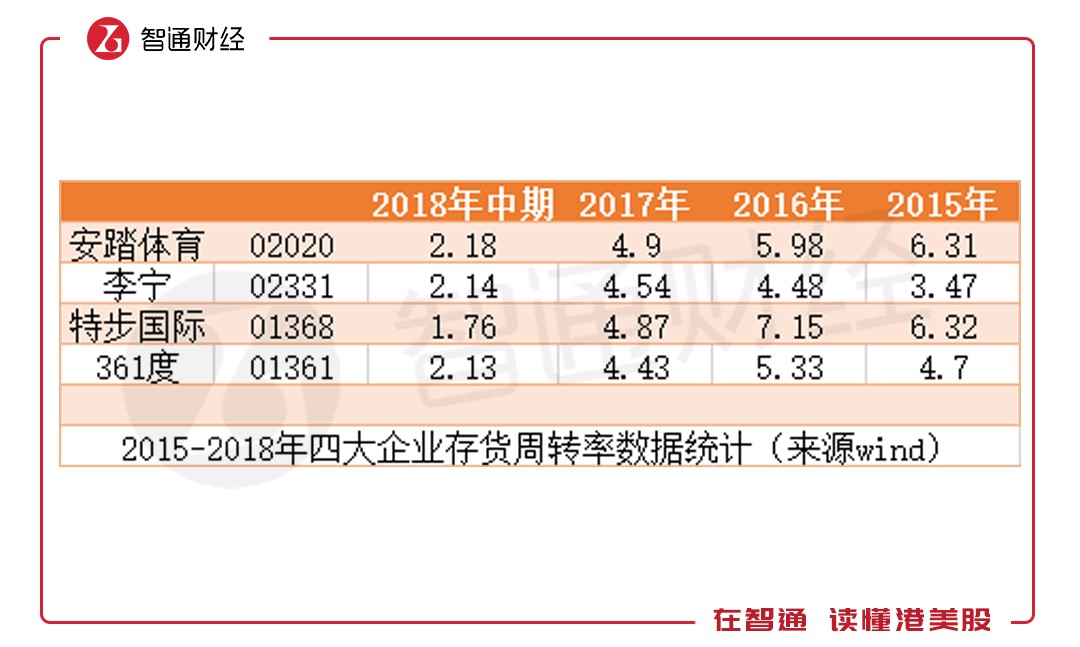 2015年時,李寧雖扭虧為盈,但在存貨周轉(zhuǎn)率上,與競爭對手仍相差較遠(yuǎn)。李寧當(dāng)時的存貨周轉(zhuǎn)率僅3.47次,而安踏體育(02020)為6.31次,特步國際(01368)為6.32次,連361度(01361)也有4.7次。