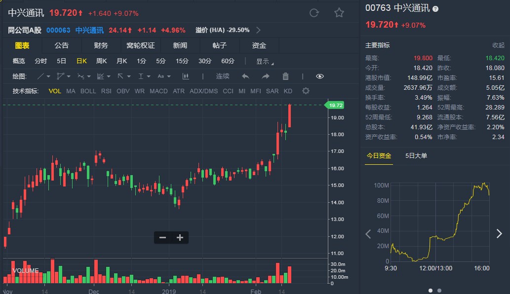 截至發(fā)稿,中興通訊(00763)漲9.07%,報19.720港元。(劉大洋)