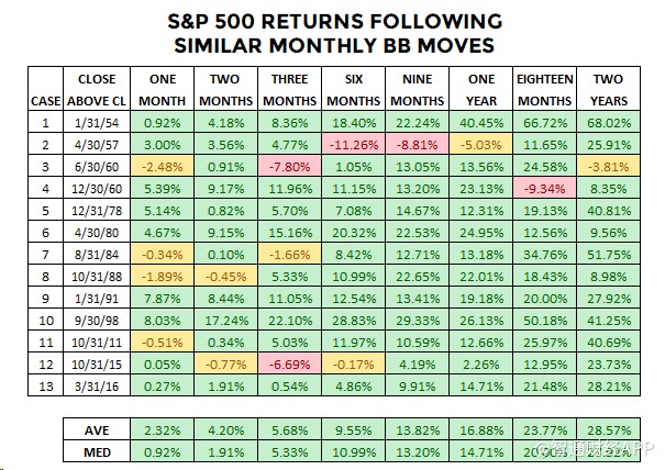 追溯到1950年,標(biāo)普500指數(shù)的月線(xiàn)圖出現(xiàn)過(guò)13次相似的走勢(shì)。如下表所示,在這一形態(tài)出現(xiàn)后的兩年里,股市基本上一直走牛: