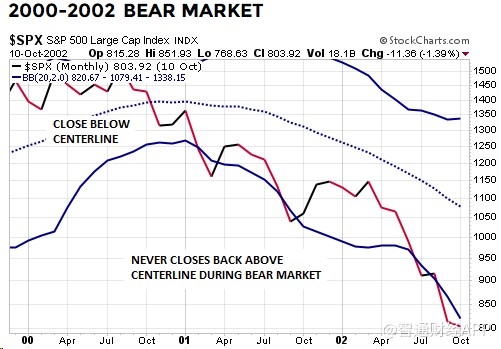 在2007年10月股市見(jiàn)頂之后,標(biāo)普500指數(shù)在2008年1月收于布林通道月線(xiàn)中軌以下,在熊市期間都無(wú)法重新回到布林通道中軌以上。2008年6月標(biāo)普500指數(shù)收于下軌以下: