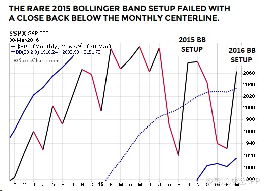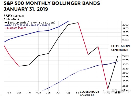 下圖顯示了標(biāo)普500指數(shù)1月31日收于布林通道月線(xiàn)中軌上方。標(biāo)普500指數(shù)在12月收于中軌以下,但在1月份便開(kāi)始反彈,并成功回到中軌以上: