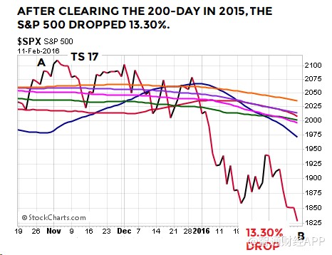 收高于200日均線(xiàn)并非安全信號(hào)。2015年,標(biāo)普500指數(shù)連續(xù)8個(gè)交易日收于200日上方,但隨后下跌了13.30%: