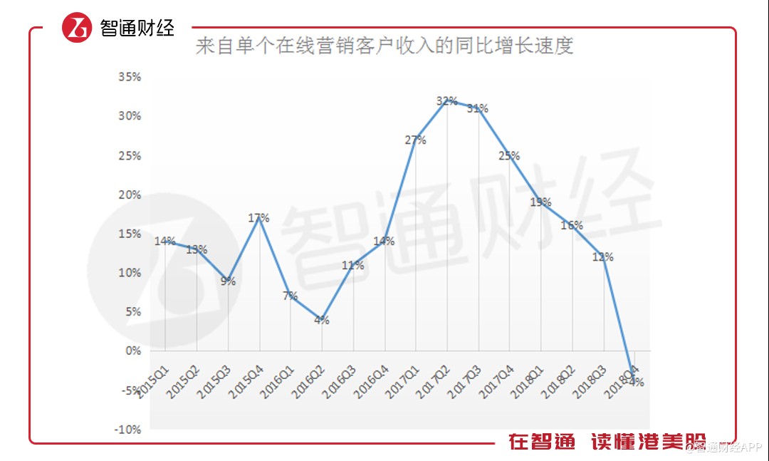 在連續(xù)下滑5個季度后,至2018年第四季度時,單個在線營銷客戶收入同比下滑4%,是2015年以來的首次負(fù)增長。而四季度在線廣告收入同比增長10%主要是因為在線營銷客戶數(shù)量的增加。財報中表示,第四季度時,公司的在線營銷客戶為52.9萬名,同比增長15%。