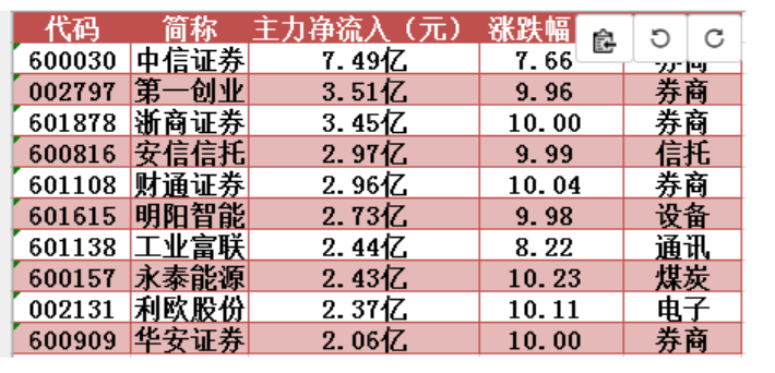 周三兩市主力資金凈流入(出)前10只個(gè)股: