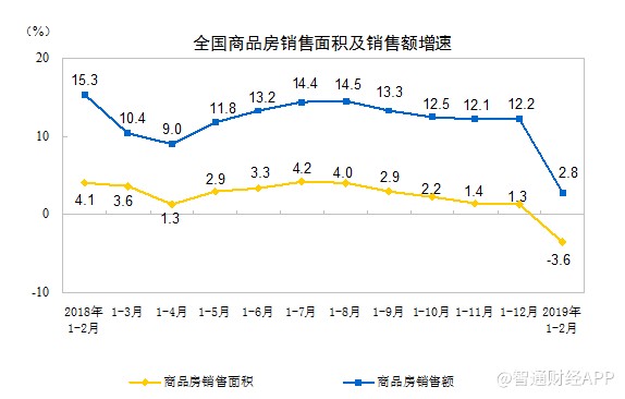1-2月份,商品房銷售面積14102萬平方米,同比下降3.6%,2018年全年為增長1.3%。其中,住宅銷售面積下降3.2%,辦公樓銷售面積下降15.7%,商業(yè)營業(yè)用房銷售面積下降13.6%。商品房銷售額12803億元,增長2.8%,增速回落9.4個(gè)百分點(diǎn)。其中,住宅銷售額增長4.5%,辦公樓銷售額下降6.2%,商業(yè)營業(yè)用房銷售額下降9.4%。