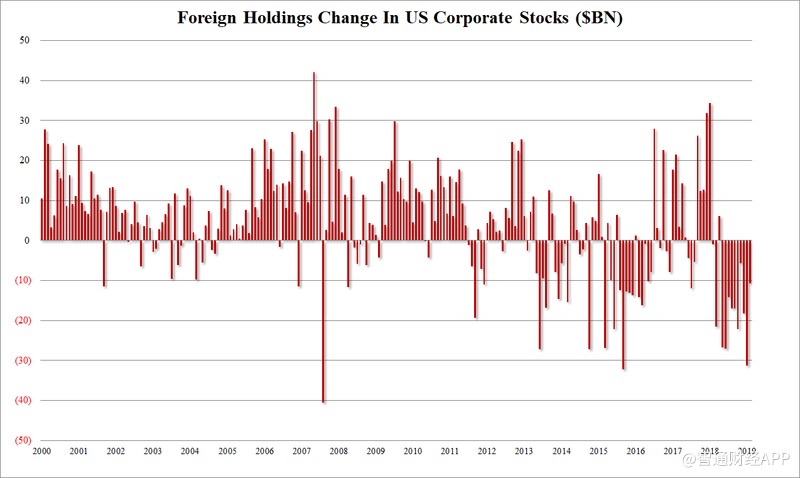 根據(jù)TIC數(shù)據(jù)顯示,外國投資者連續(xù)第10個(gè)月和過去13個(gè)月中的12個(gè)月賣出美國股票,創(chuàng)歷史新高: