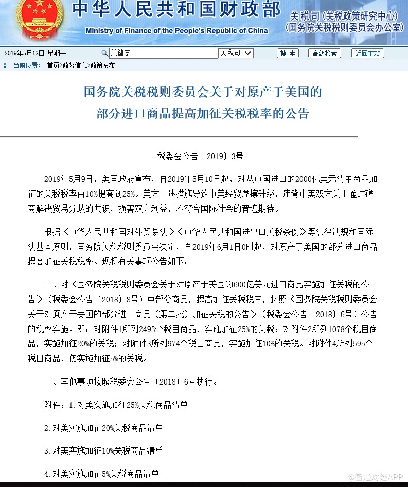 根據(jù)《中華人民共和國(guó)對(duì)外貿(mào)易法》《中華人民共和國(guó)進(jìn)出口關(guān)稅條例》等法律法規(guī)和國(guó)際法基本原則,國(guó)務(wù)院關(guān)稅稅則委員會(huì)決定,自2019年6月1日0時(shí)起,對(duì)原產(chǎn)于美國(guó)的部分進(jìn)口商品提高加征關(guān)稅稅率?,F(xiàn)將有關(guān)事項(xiàng)公告如下: