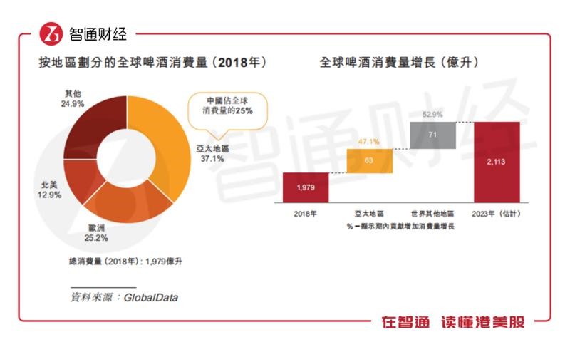 從行業(yè)角度來看,根據(jù)GlobalData的數(shù)據(jù),截至2018年,按消費(fèi)量及價(jià)值計(jì)算,亞太地區(qū)是全球最大啤酒消費(fèi)市場,也是全球啤酒銷量增速最快的地區(qū)之一。2018年亞太占全球啤酒銷量的37%,且預(yù)計(jì)2018年至2023年將貢獻(xiàn)全球啤酒銷量增幅的47%。