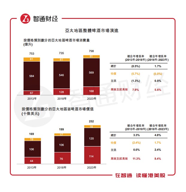 同時(shí),亞太啤酒市場還表現(xiàn)出明顯的高端化趨勢。根據(jù)GlobalData的數(shù)據(jù),2018年至2023年,亞太地區(qū)高端及超高端啤酒的銷量會以5.6%的年均復(fù)合增長率增長至168億升,市場價(jià)值則以8.4%的年均復(fù)合增長率增長至1140億元。