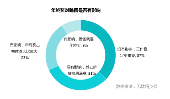 但是即便大部分人對(duì)今年的年終獎(jiǎng)的增長(zhǎng)沒有信心,卻很難讓他們因?yàn)槟杲K獎(jiǎng)而跳槽。半數(shù)以上的受訪者年終獎(jiǎng)?wù)既晔杖氲谋壤齼H為20%左右,即便不滿意年終獎(jiǎng),但工作的穩(wěn)定性、工作環(huán)境、企業(yè)福利是他們更看重的要素。有3成受訪者表示收入依賴年終獎(jiǎng),如果年終獎(jiǎng)不滿意一定會(huì)尋找機(jī)會(huì)跳槽。因此企業(yè)在人才管理上,需要特別注意年終獎(jiǎng)對(duì)于員工保留的影響,提前做好預(yù)防工作。