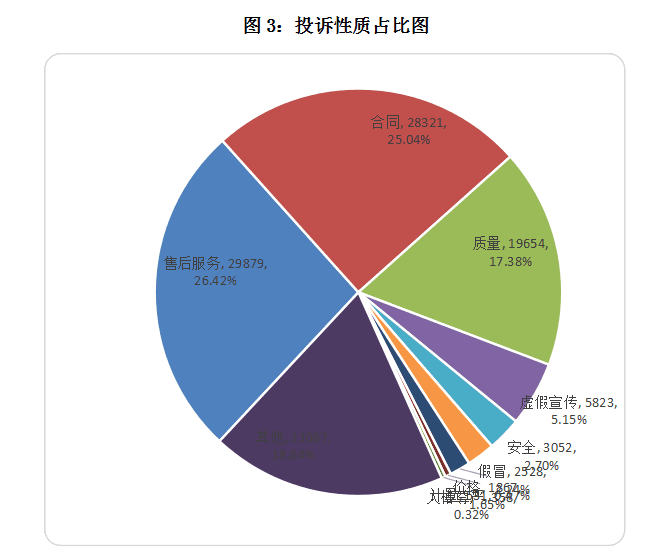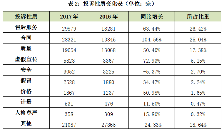 2017年,消費者反映最突出的投訴性質(zhì)分別是售后服務(wù)29879宗,占26.42%;合同28321宗,占25.04%;質(zhì)量19654宗,占17.38%;三大性質(zhì)類別的投訴占比都超過了15%。