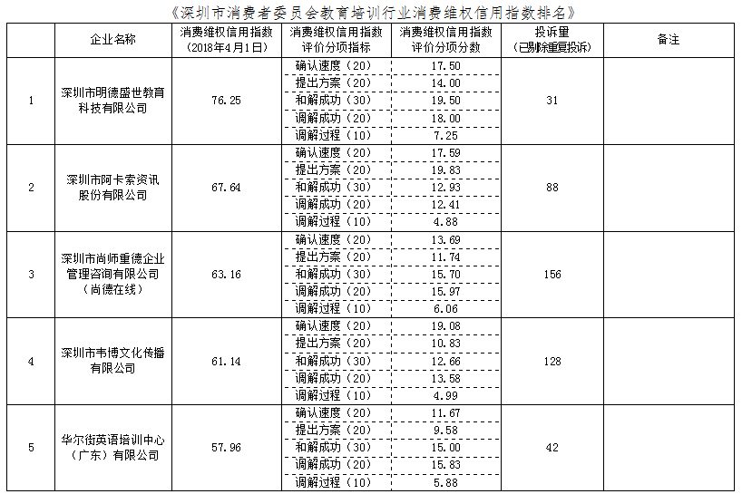 在本次公布的教育培訓(xùn)行業(yè)消費維權(quán)信用指數(shù)排名中,深圳市明德盛世教育科技有限公司的消費維權(quán)信用指數(shù)為76.25,排名第一,其2017年4月1日至2018年3月31日期間的投訴量為31宗;坤澤教育(深圳)有限公司的消費維權(quán)信用指數(shù)為14.24,排名第十,其2017年4月1日至2018年3月31日期間的投訴量為42宗。