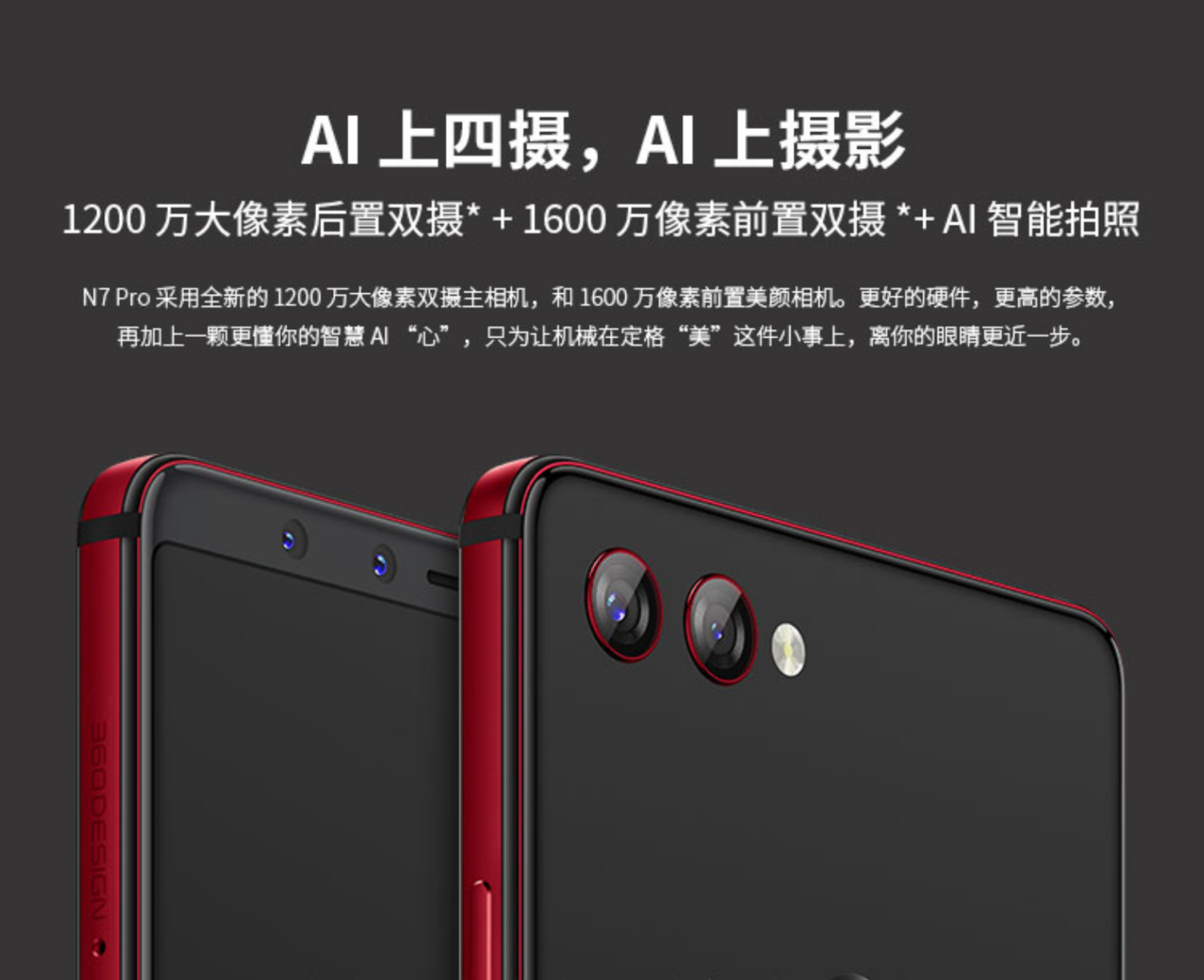 360手機(jī)N7 Pro采用了雙面玻璃機(jī)身設(shè)計(jì),無(wú)劉海5.99英寸全面屏,分辨率2160×1080像素,有珊瑚紅和瑪瑙黑兩色可選。作為2018年度的旗艦機(jī)型,配置上,N7 Pro搭載當(dāng)前高通家族中最受關(guān)注的驍龍710處理器,4000mAh大容量電池,支持18W快充,官方宣稱20分鐘可充電30%,100分鐘可充滿。此外在拍照方面,360手機(jī)N7 Pro采用了堪稱耀眼的四攝設(shè)計(jì)。
