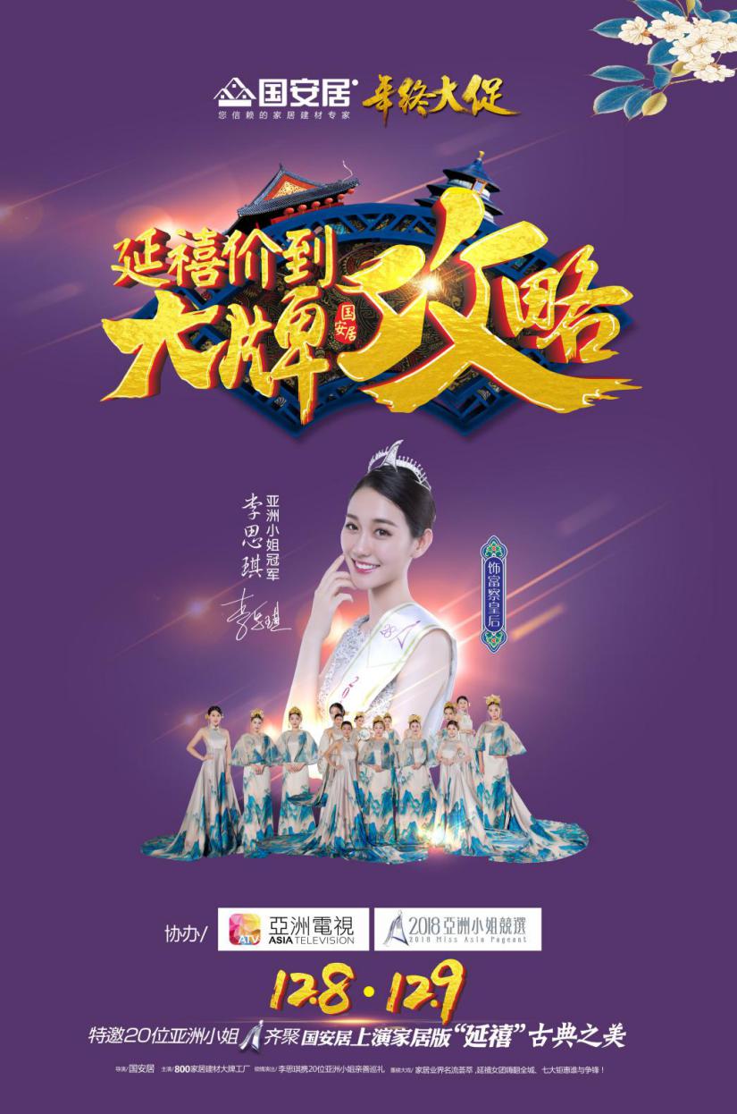 作為2018年收官之作,國(guó)安居非常重視此次年終盛典,力求將本次盛典做大做好,以回饋廣大新老顧客的長(zhǎng)期支持與厚愛(ài)。為此,國(guó)安居本次特邀2016亞姐冠軍李思琪攜手20位2018亞洲小姐候選佳麗親臨國(guó)安居親善巡禮,集智慧與美麗于一身的亞姐佳麗帶您領(lǐng)略“延禧攻略”古典之美。為廣大業(yè)主獻(xiàn)上一場(chǎng)美輪美奐的古典文化視覺(jué)盛宴。