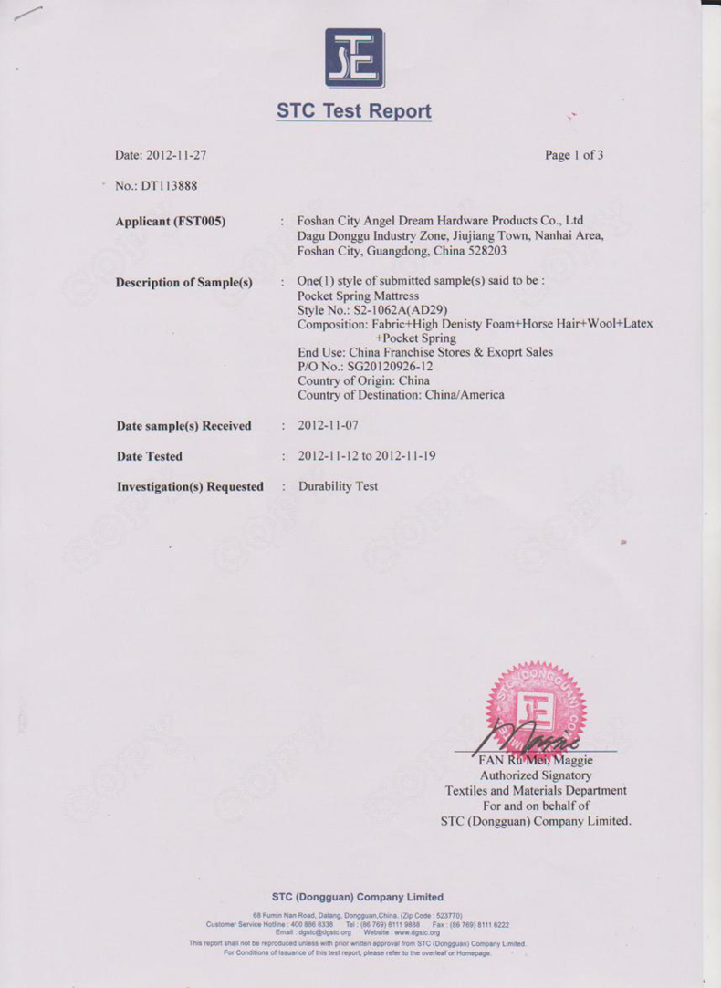 雙重熱處理起到一個全面消除了彈簧的內應力,增加抗疲勞強度,提高了彈性極限,使彈簧的彈性、拉力和回彈力更好,床芯不易凹塌變形,彈簧不易折斷。經(jīng)權威檢測機構STC測試證明:嚴格按照美標ASTM1566耐疲勞測試,西婭圖品牌床墊達到10萬次連續(xù)錘壓不變形。(吳艷 通訊員/阿東)