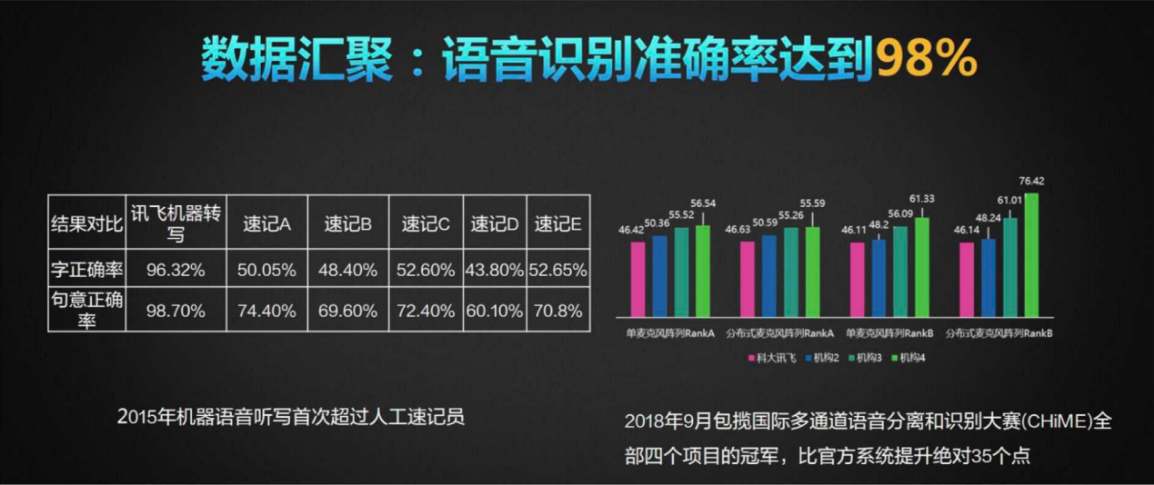 在英文語音識別、機器閱讀理解、國際識別挑戰(zhàn)賽等多個A.I.領(lǐng)域的國際賽事 中,科大訊飛均名列前茅, 至今已獲得12項世界第一。2018年9月,訊飛再次包攬國際多通道語音分離和識別大賽(CHiME-5)全部四個項目的冠軍,該大賽被稱為“史上最難語音識別任務(wù)”,考察的是在不同場景中自由交談的遠場語音識別效果。也再次證實了訊飛語音識別在噪音、口音和遠場識別挑戰(zhàn)下的絕對領(lǐng)先優(yōu)勢。與此同時,訊飛轉(zhuǎn)寫引擎于2005年開始應(yīng)用服務(wù),期間歷經(jīng)數(shù)次迭代升級。