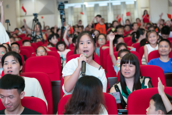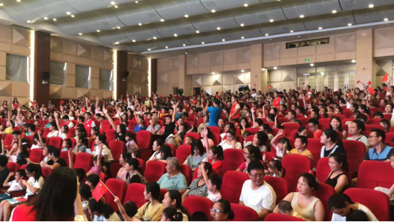 接下來(lái),為進(jìn)一步增強(qiáng)青少年兒童的愛國(guó)意識(shí),主辦方將戲劇教育與愛國(guó)教育有機(jī)融合,于文明知識(shí)問答后,邀請(qǐng)近千名觀眾一起舞動(dòng)小紅旗,齊聲唱響《我和我的祖國(guó)》,點(diǎn)燃了在場(chǎng)每一位觀眾的愛國(guó)熱情,觀眾們跟隨著旋律,共同歌唱祖國(guó),深情祝福祖國(guó)明天更加輝煌。
