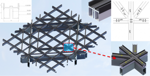 由于每一個小“盒子”的顏色都是獨一無二的,需要在生產階段為每一塊零件編號,并在安裝時按編號一塊一塊進行組合。更讓項目部犯難的是,在根據原有方案進行樣板安裝時,“盒子”全部下垂,原因是菱形盒子突出內層幕墻1米,難以固定支撐。后經反復研究試驗,決定在裝盒子前,在墻上做一個外觀似蜘蛛網的控制體系,為每個菱形盒子準確定位,將安裝精度控制在毫米級。