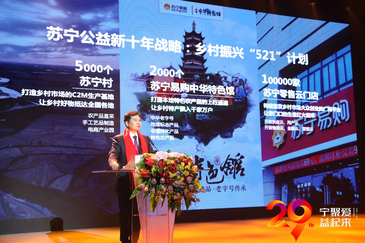 (圖:蘇寧控股集團董事長張近東發(fā)布鄉(xiāng)村振興“521計劃”)