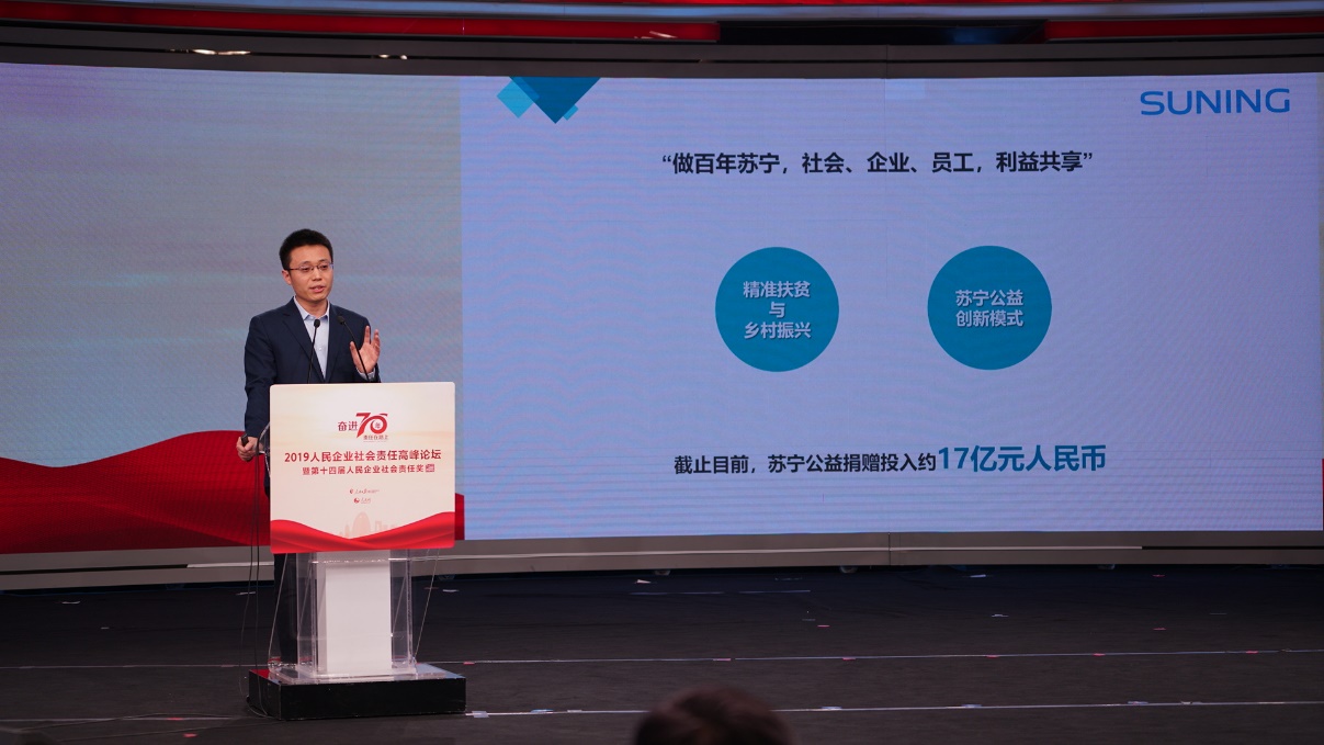 蘇寧控股集團黨委副書記、蘇寧公益基金會副理事長馬康在高峰論壇上做了專題演講,分享蘇寧的扶貧模式和成果。