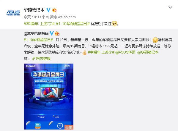 1月10日,今年的蘇寧易購華碩超品日將再次啟動,1月3日正式進入預熱階段,今天早上蘇寧電腦數(shù)碼官微賬號,發(fā)布了今年華碩超級品牌日活動的正式信息,華碩官方賬號也第一時間與之進行了回應互動。