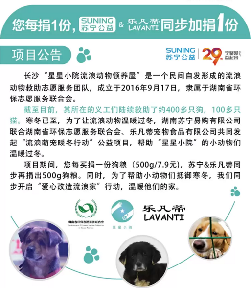 要說(shuō)本次暖心活動(dòng)最受關(guān)注的,還屬蘇寧線上線下聯(lián)動(dòng)發(fā)起的“愛心狗糧7.9元捐”活動(dòng)?;顒?dòng)期間,愛心人士只需要以7.9元的折扣價(jià),在蘇寧易購(gòu)線上購(gòu)買一斤樂凡蒂狗糧就可完成捐贈(zèng)。同時(shí),蘇寧和樂凡蒂將加捐1斤。相當(dāng)于7.9元捐贈(zèng)兩斤狗糧。而這些愛心狗糧,將直接發(fā)往長(zhǎng)沙“星星小院流浪動(dòng)物領(lǐng)養(yǎng)屋”。