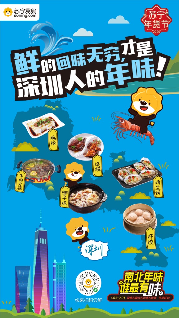說起年味必提到年夜飯,中國地大物博每個城市的年夜飯各有特色,究竟哪個城市的年味最濃,各家眾說紛紜。為此華南、華中、華北具有代表性的四個城市紛紛站出來為各家城市的年味代言,深圳、武漢、長沙、鄭州四城分別從年味、年俗、年貨、方言等方方面面為消費(fèi)者獻(xiàn)上了一頓年味大餐。那些記憶里存在的各色過年儀式,味覺里保留的故鄉(xiāng)味道,腦海里熟悉的地方鄉(xiāng)音,在這場年味比拼里一一重現(xiàn),喚醒了大家對于過年的期許,引發(fā)社交平臺上大家對于年味的分享。對于深圳這個移民大城往往被貼上沒有特色年貨的標(biāo)簽,其實不然,作為嶺南文化重要傳承地的深圳擁有眾多特色年俗。并且隨著越來越多的人選擇春節(jié)留在深圳過年,深圳的年味也越來越濃,因此深圳蘇寧在本次南北年味的話題中,不斷深挖深圳年味,打造了一張?zhí)厣某鞘写汗?jié)名片。