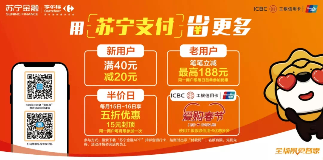 注意啦!使用蘇寧支付省更多!下載“蘇寧金融A(yíng)PP”并綁定銀行卡,在家樂(lè)福門(mén)店結(jié)賬時(shí)出示“付款碼”,新用戶(hù)可享滿(mǎn)40元減20元,老用戶(hù)筆筆立減,最高188元。每月15日至16日半價(jià)日,蘇寧支付用戶(hù)還可享五折優(yōu)惠,15元封頂。名額有限,先到先得。