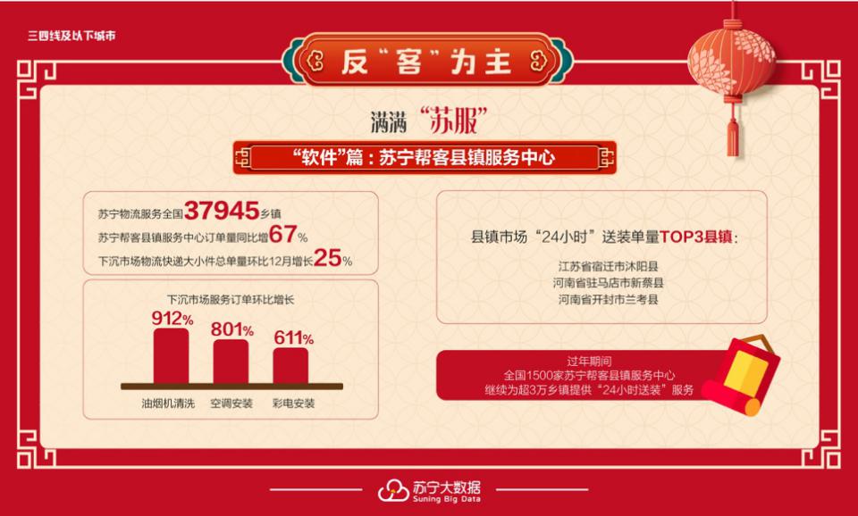 三四線城市則設(shè)立了蘇寧幫客縣鎮(zhèn)服務(wù)中心,數(shù)據(jù)顯示春節(jié)蘇寧幫客訂單量同比增長67%,TOP3縣鎮(zhèn)為宿遷沭陽縣、貴港桂平市、福州閩侯縣;最受歡迎服務(wù)為電視送裝一體服務(wù),訂單量同比增長89%。在過年期間,全國1500家蘇寧幫客縣鎮(zhèn)服務(wù)中心,將繼續(xù)為超3萬鄉(xiāng)鎮(zhèn)提供“24小時(shí)送裝”服務(wù)。