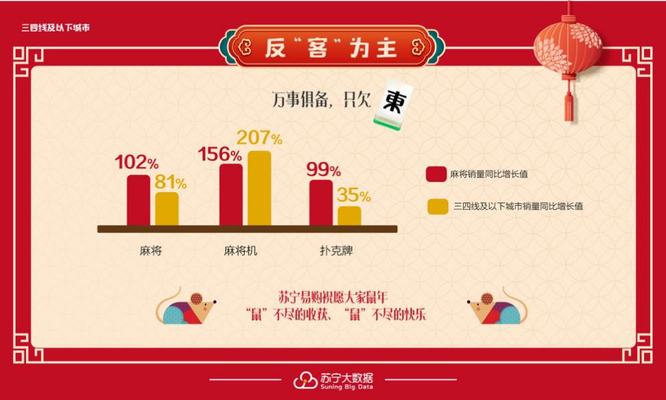 除此以外,春節(jié)作為“熬夜黨”們的主戰(zhàn)場,零食和麻將一直是必備物料,三四線城市在這其中的消費(fèi)力也有了明顯增長。蘇寧數(shù)據(jù)顯示,零食禮包銷量同比增長137%,三線及以下城市銷量同比增長158%;堅(jiān)果禮包銷量同比增長142%,三線及以下城市銷量同比增長279%;麻將銷量同比增長102 %,三四線及以下城市銷量同比增長81 %;麻將機(jī)銷量同比增長156 %,三四線及以下城市銷量同比增長達(dá)到了207 %。