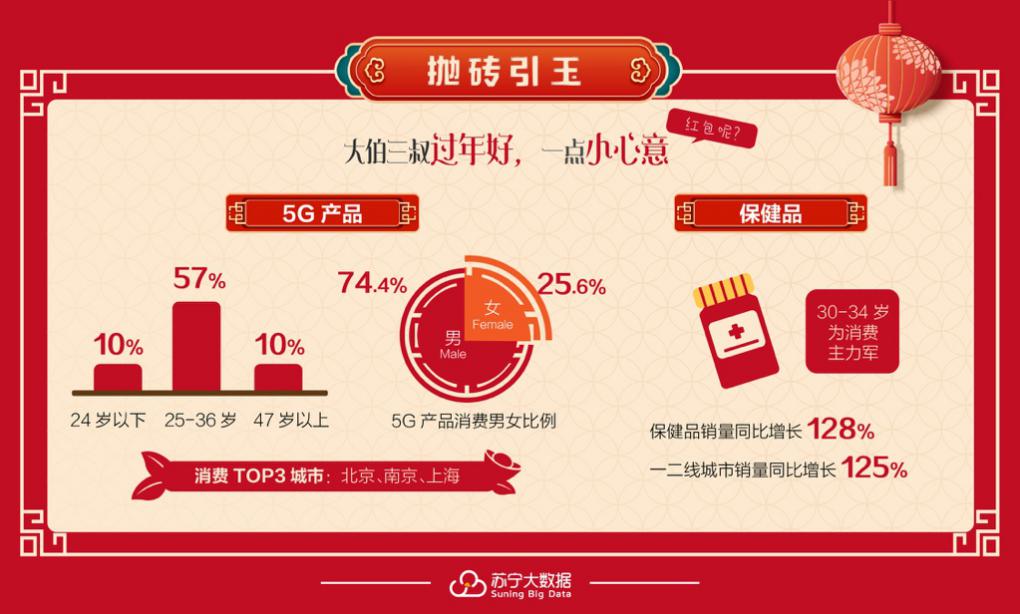 要說2019年末人們討論最多的關(guān)鍵詞有哪些,5G一定是其中一個(gè)。除了保健品,5G產(chǎn)品成了人們的春節(jié)消費(fèi)新寵,報(bào)告顯示,5G產(chǎn)品銷量最好的三個(gè)城市分別為北京、南京、上海,消費(fèi)者年齡主要集中在25-36歲之間,占比總體的57%。有趣的是,24歲以下的年輕人和47歲以上中老年人,占比均在10%左右。看來年輕人回家過年也不忘把“潮流單品”帶給父母一輩。