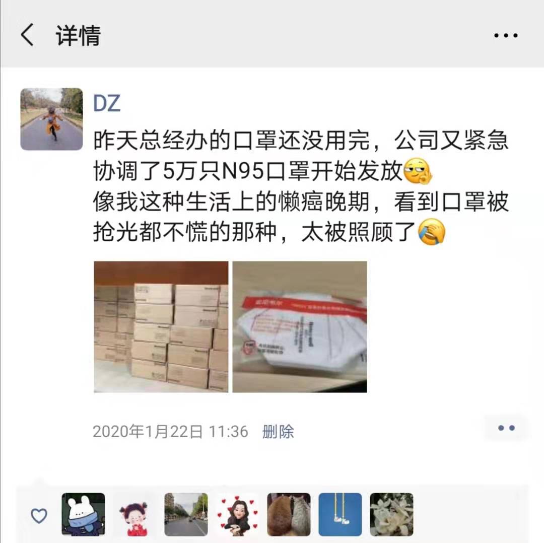 春節(jié)放假前夕,疫情形勢(shì)陡然嚴(yán)峻。在蘇寧南京總部工作的小丁清楚地記得,1月2 2 日那天,她在上班的路上,看到戴口罩的人多了起來(lái),還和小伙伴念叨著也要趕緊買(mǎi)些。結(jié)果,當(dāng)天上午,部門(mén)就給每人發(fā)了一個(gè)全新的N9 5 口罩,讓她倍感驚喜和暖心。原來(lái),蘇寧總部緊急調(diào)集了5萬(wàn)個(gè)口罩發(fā)到員工手中,各大區(qū)也紛紛緊急調(diào)貨給員工發(fā)放。自稱(chēng)“懶癌晚期”、平時(shí)連朋友圈都很少發(fā)的她,忍不住發(fā)圈為公司點(diǎn)贊。