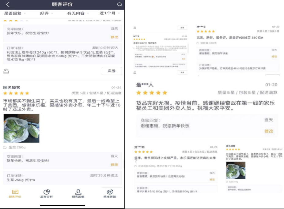 揀貨、核對訂單、打包、再次確認商品無誤,在規(guī)定時間內(nèi)將商品給到外賣騎手……這是一項挑戰(zhàn)體力與腦力的“細致活”。為了維持家樂?!?公里內(nèi)、1小時速達的配送到家”服務(wù)順利運作,每天,家樂福門店的電商主管還需要協(xié)調(diào)不同部門的值班員工通力合作。由于春節(jié)期間人員緊缺,超市一線員工幾乎每天都在與時間賽跑?!耙圆蛔儜?yīng)萬變,在這場戰(zhàn)役中不斷的完善不斷的調(diào)整,每一分每一秒都是十足寶貴的?!秉S福填說,雖然沒有回家過年,但看到顧客們一致的好評留言,自己心里非常高興?!邦櫩偷暮迷u就是對我們工作的最大鼓勵和認可。”