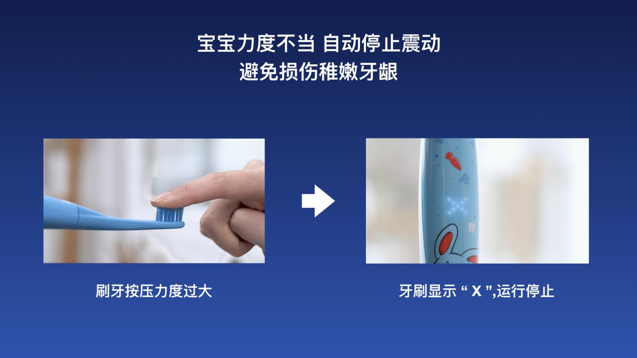 S7000K智能音樂兒童電動牙刷還支持自動過壓降頻保護,當孩子在刷牙力度過大時,該功能就會啟動,自動停止振動,屏幕LED還會顯示出X型警告,保護孩子稚嫩的牙齦及牙釉質(zhì)。