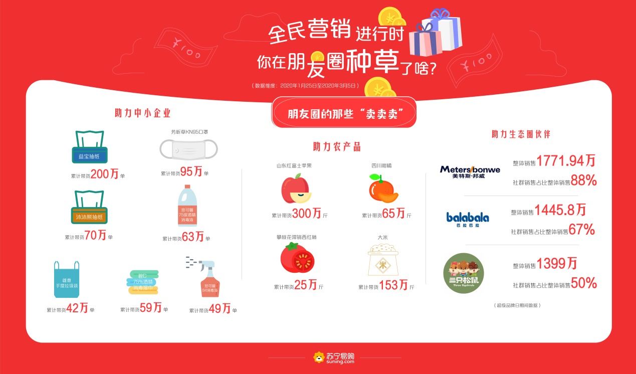 深圳新聞網(wǎng)2020年3月10日訊 線(xiàn)上買(mǎi)菜、線(xiàn)上看病、直播上課、遠(yuǎn)程健身……“宅經(jīng)濟(jì)”爆發(fā),使得社群私域流量積累的能量進(jìn)一步凸顯,全民營(yíng)銷(xiāo)成為新風(fēng)口。近日,蘇寧易購(gòu)發(fā)布全民營(yíng)銷(xiāo)大數(shù)據(jù),2020年1月25日至3月5日,蘇寧推客買(mǎi)家數(shù)和賣(mài)家數(shù)分別突破千萬(wàn)、百萬(wàn)大關(guān),80后成為朋友圈買(mǎi)、賣(mài)“雙主力”,糧油休食、個(gè)護(hù)家清、生鮮等產(chǎn)品成為最受歡迎的消費(fèi)品類(lèi)。