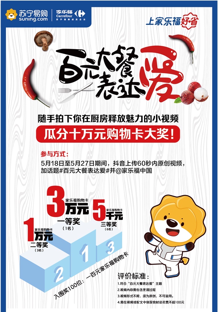近期陳老伯和女兒聊的最多的除了做菜,還有父女倆都很期待的一場(chǎng)比賽。據(jù)悉,5月18日至6月18日,家樂(lè)福將舉辦一場(chǎng)主題為“百元大餐表達(dá)愛(ài)”的鄰家大廚視頻PK賽,鼓勵(lì)參賽者做道有故事的菜,向摯愛(ài)的人表達(dá)濃濃的情意。你負(fù)責(zé)做菜,家樂(lè)福負(fù)責(zé)買單。你無(wú)需具備可媲美專業(yè)廚師的高超技藝,僅需擁有一顆熱愛(ài)美食的心和一雙巧手,無(wú)論是國(guó)人經(jīng)典標(biāo)配的“四菜一湯”,抑或是最適合情侶的西式浪漫—牛扒配紅酒,隨你發(fā)揮。以百元預(yù)算準(zhǔn)備食材,將烹調(diào)過(guò)程上傳抖音。屆時(shí),突圍選手將有機(jī)會(huì)瓜分價(jià)值十萬(wàn)元的購(gòu)物卡大獎(jiǎng)。